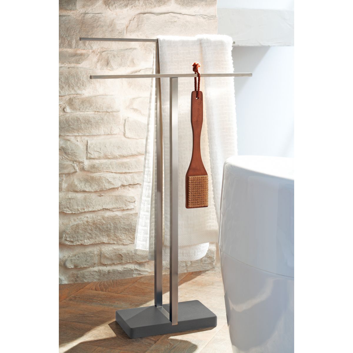 Elegantní a robustní věšák na ručníky se dvěma rameny. Nadčasový minimalistický design a vysoce kvalitní materiály - nerezová ocel a polyston. Stojan má těžkou základnu, takže je robustní, ale zároveň jej lze umístit kamkoli.