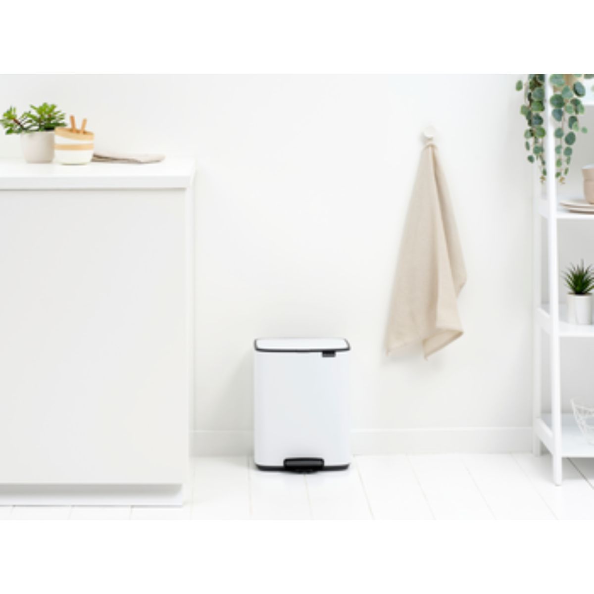 Velmi užitečný pedálový koš Brabantia Bo s objemem 12 litrů! Dostatečně malý na to, abyste ho mohli schovat pod pracovní desku, a dostatečně stylový na to, abyste ho mohli nechat na očích. Je užitečný také díky svému obdélníkovému designu, který šetří místo, hygienickému ovládání pomocí pedálu a vyjímatelnému vnitřnímu kbelíku. Jemně se zavírající víko se otevírá lehkým poklepáním nohou, nebo jej můžete otevřít ručně zvednutím okraje víka. Ještě hygieničtější - tento koš je vybaven funkcí stay-open, která usnadňuje čištění a výměnu kazety. Ještě snadnější - tento krásný koš na prádlo má na zadní straně rukojeť, která vám umožní přenášet jej z místnosti do místnosti. Do toho Bo!