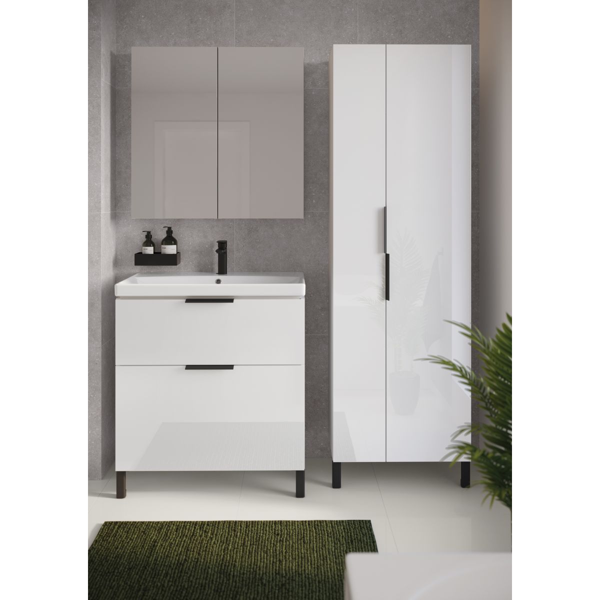 Nástěnná skříňka se zrcadlovým čelem a 3 policemi uvnitř, která slouží jako zrcadlo a úložný prostor pro drobnou kosmetiku. Skříňka má bezúchytkový systém otevírání dvířek a tiché zavírání. Korpus skříňky je vyroben z laminované dřevotřísky.