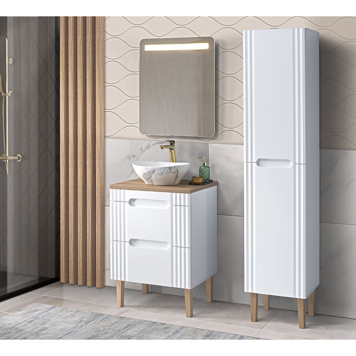 Kolekce Fiji v sobě spojuje modernost a nadčasový styl. Nábytek této řady lze sestavit jako závěsný i stojící na dřevěných nohách. Kolekce obsahuje vysoký podstavec, skříňky pod umyvadlo a desky v barvě dubu Coastal Evoke ve velikostech 60 cm, 80 cm, 100 cm a 120 cm. Úchytky byly nahrazeny moderním frézováním podumyvadla a čela skříněk se vyznačují jemným prolisem na bocích.