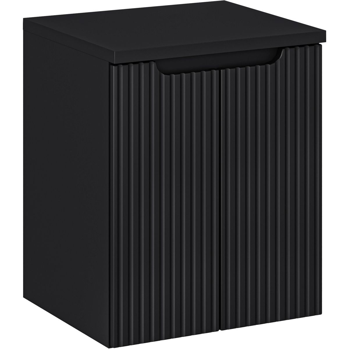 Umyvadlová skříňka má na čelech vyfrézované svislé drážky, které jí dodávají moderní vzhled. Černá matná barva dokonale ladí s úchytkou ve stejném odstínu. Pracovní deska o šířce 50 cm celek skvěle doplňuje, díky čemuž sestava působí elegantně a stylově.