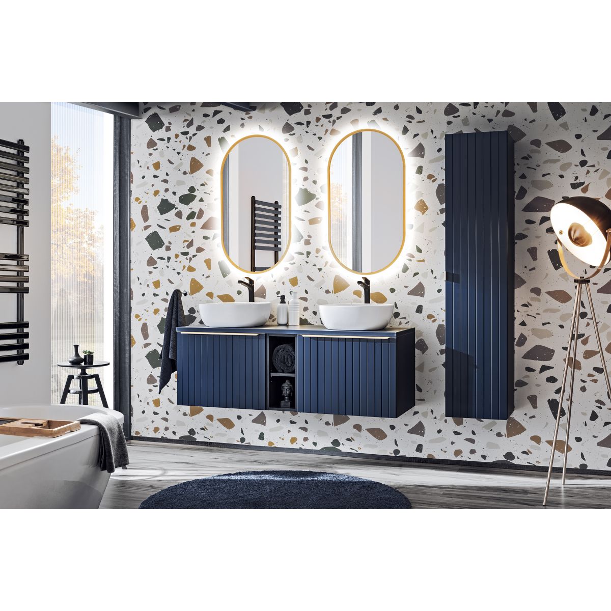 Koupelnová deska z MDF v barvě Indigo Blue. Nezbytný prvek při vytváření sestav s ostatními výrobky této řady.