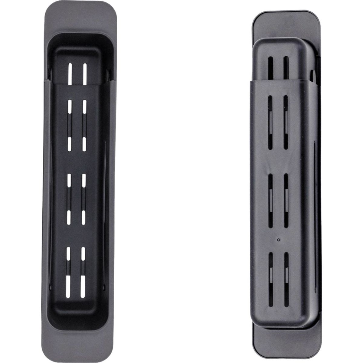 Černý rozkládací košík do dřezu je velmi užitečným kuchyňským doplňkem. Má obdélníkový tvar s perforovaným dnem, které umožňuje odtok vody, což ho činí ideálním pro mytí zeleniny a ovoce. Košík je vybaven rozkládací konstrukcí, díky které jej lze přizpůsobit jakékoli velikosti dřezu. Má také úchyty po stranách, které usnadňují vyjmutí a přenášení. Design je minimalistický a moderní, hodí se k většině dřezů.