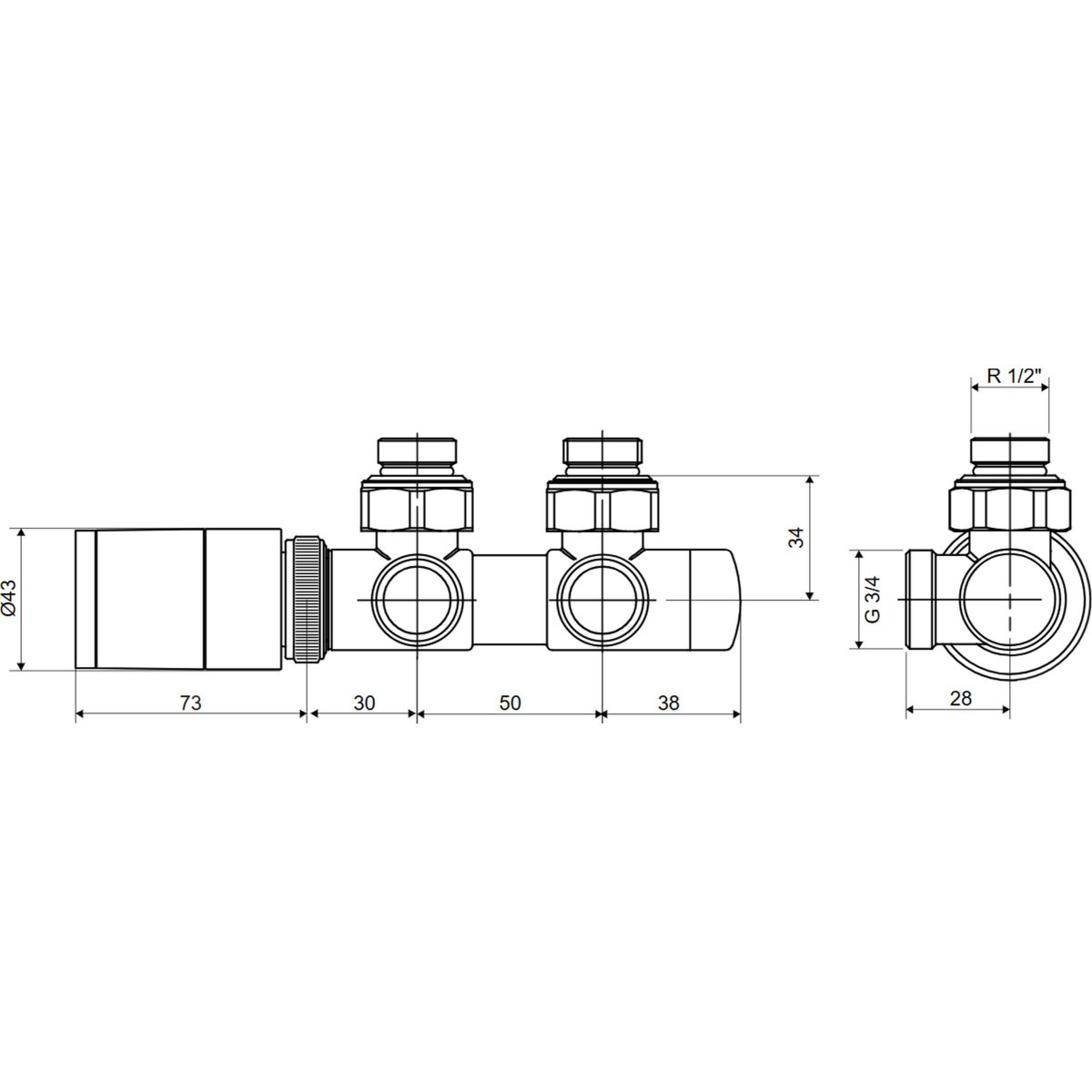 Termostatická souprava Caldo se spodním připojením s roztečí 50 mm. Umožňuje přesnou regulaci teploty a průtoku vody pro optimální výkon topného systému.
