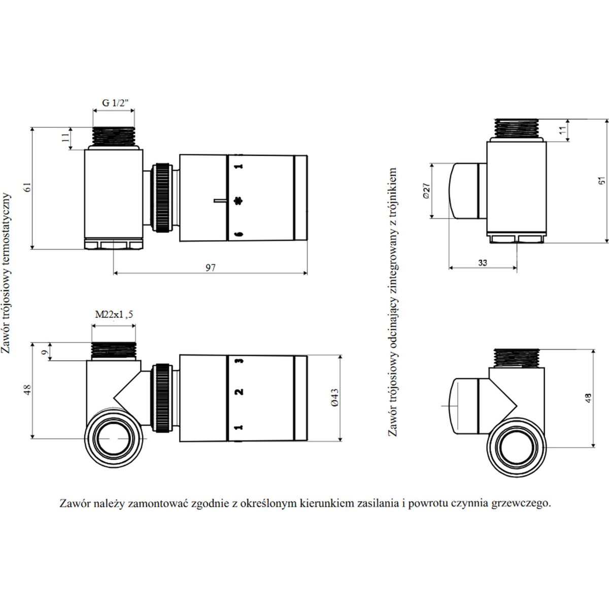 Důležité! Napájení instalace se nachází na straně termostatické vložky. Pokud je přívodní trubka centrálního vytápění na levé straně – při pohledu na radiátor zepředu – bude ventil s hlavou na levé straně (vyberte sadu v levé verzi). Série Caldo zahrnuje integrované termostatické sady, tříosé a tříosé s možností montáže topného tělesa, jakož i maskovací sady. Ventily jsou k dispozici v barvách: chrom, matná černá, matná bílá a cappuccino. Pro estetické dokončení instalace jsou nabízeny maskovací sady v barevných variantách přizpůsobených ventilům.