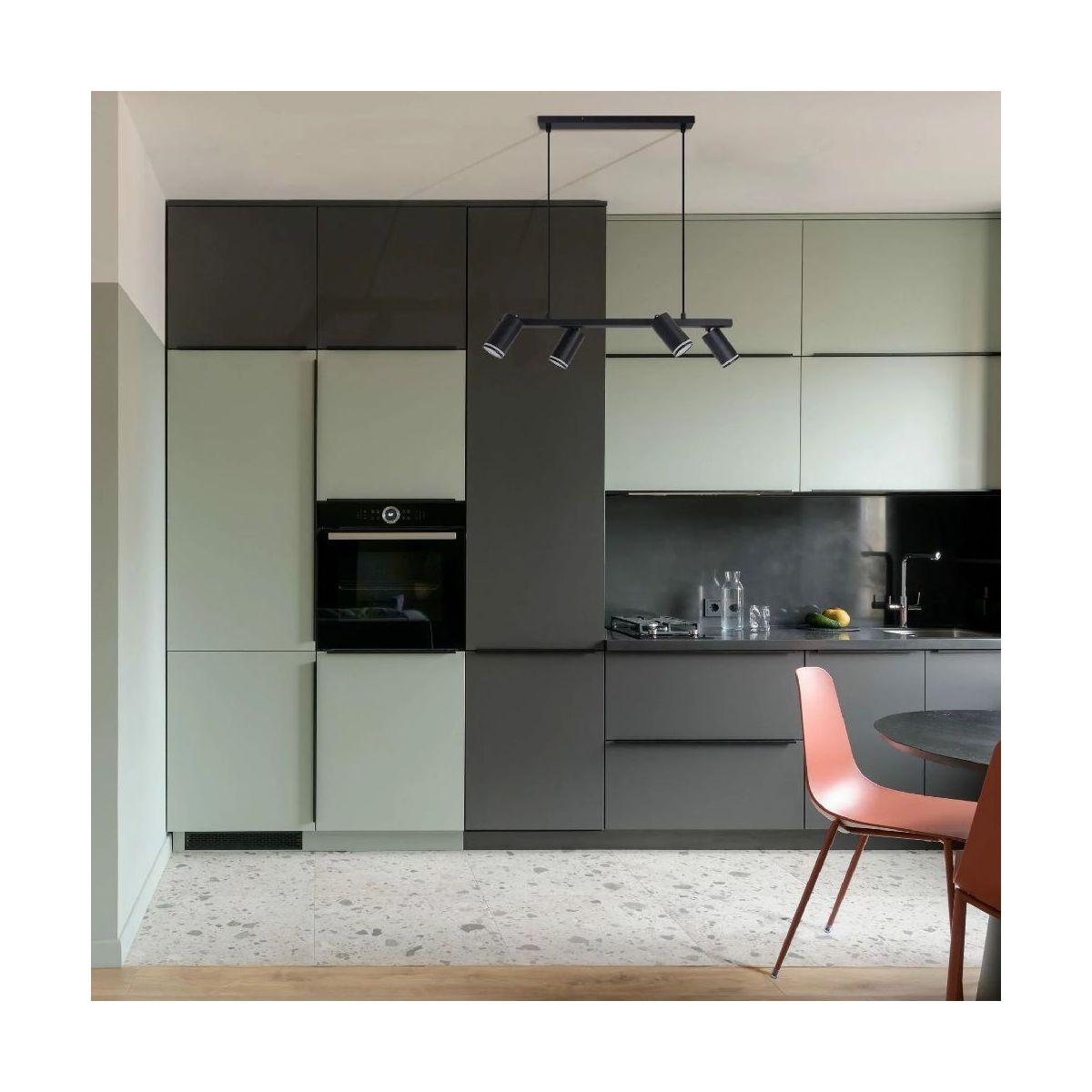 Čtyři světelné body s objímkou GU10 umožňují rovnoměrné osvětlení stolu nebo kuchyňského ostrůvku. Možnost samostatného výběru žárovek s výkonem do 10 W umožňuje přizpůsobit barvu a intenzitu světla náladě a funkci místnosti. Celý systém je napájen napětím 230 V, což zajišťuje spolehlivost a jednoduchou montáž.
