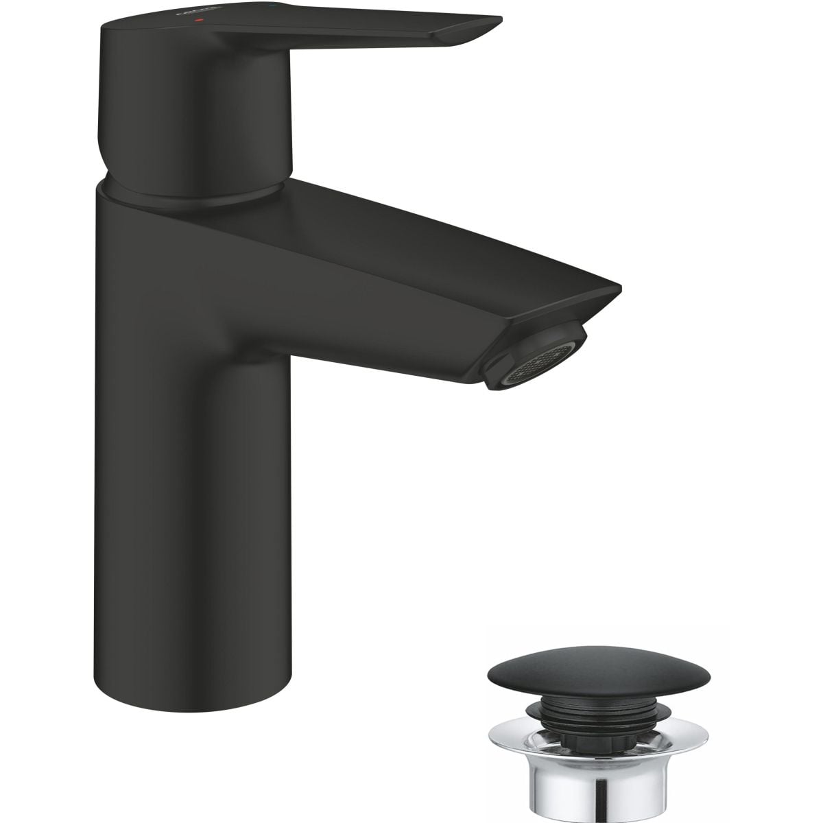 Součástí sady stojící umyvadlové baterie Grohe Start S QuickFix černá matná 235502432 je zátka klik-klak 1 1/4", která zvyšuje pohodlí při každodenním používání – stačí lehce stisknout, aby se odtok uzavřel nebo otevřel.