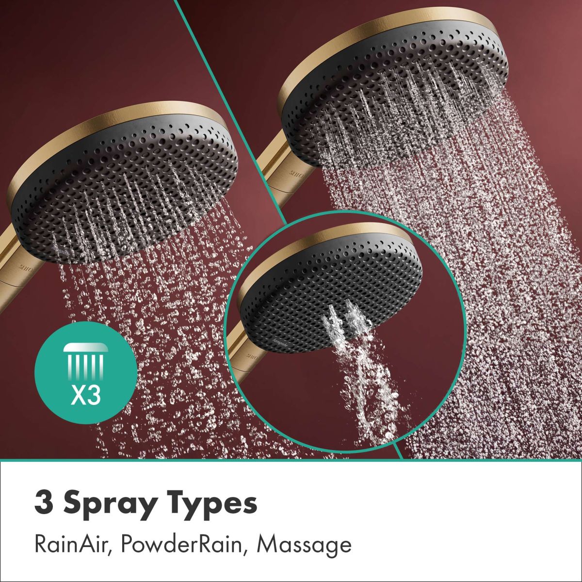 - Široký výběr: podle nálady si můžete pomocí tlačítka (Select) vybrat jeden ze tří typů proudu na sprchové hlavici. Sprchová hlavice vás hýčká proudem RainAir – podle preferencí lze při montáži nastavit jako alternativní možnost také hansgrohe PowderRain