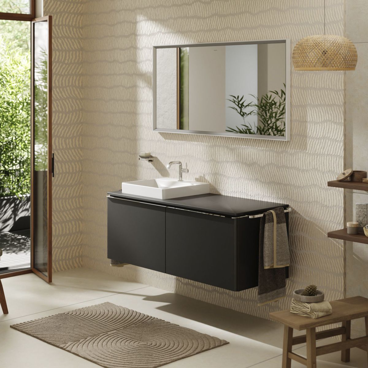 Obrovský úložný prostor vpravo od umyvadla okamžitě upoutá pozornost. Je to prostorný prostor, který pojme nezbytné koupelnové doplňky a kosmetiku. Samotná deska se skládá z lisované třívrstvé dřevotřísky pocházející z lesů obhospodařovaných udržitelným způsobem. Stejně jako všechny ostatní materiály koupelnového nábytku hansgrohe se ideálně hodí do vlhkých podmínek v koupelně.