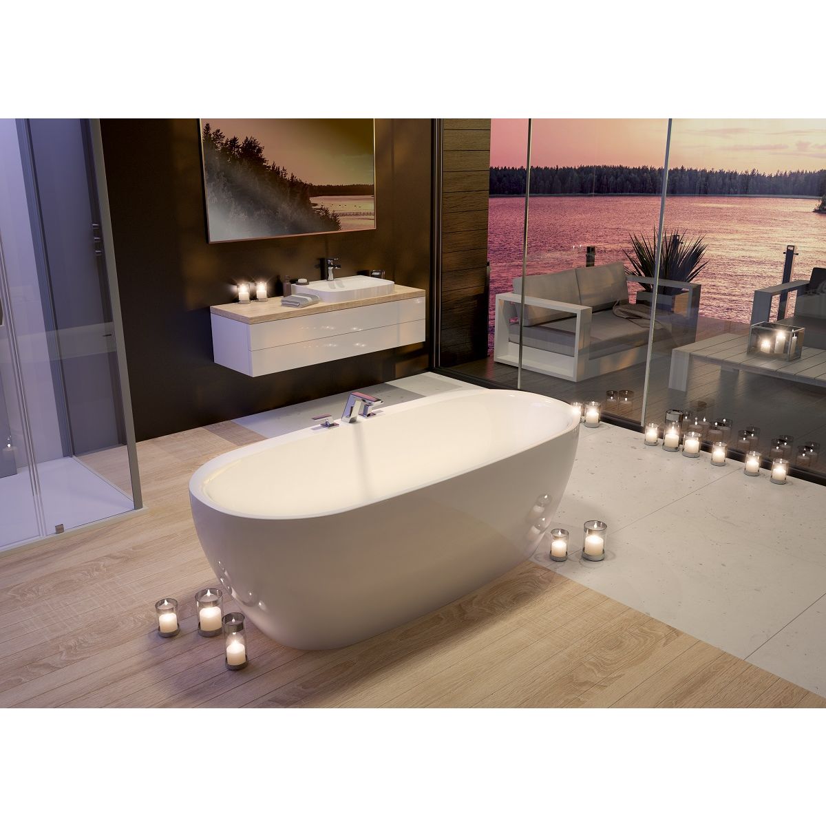 * Kompletní oválná volně stojící vana obsahuje: integrovaný přepadový systém s napouštěním vany přes přepad, odtokový systém s uzávěrem typu „Klick-Klack“, připojovací instalační hadici.