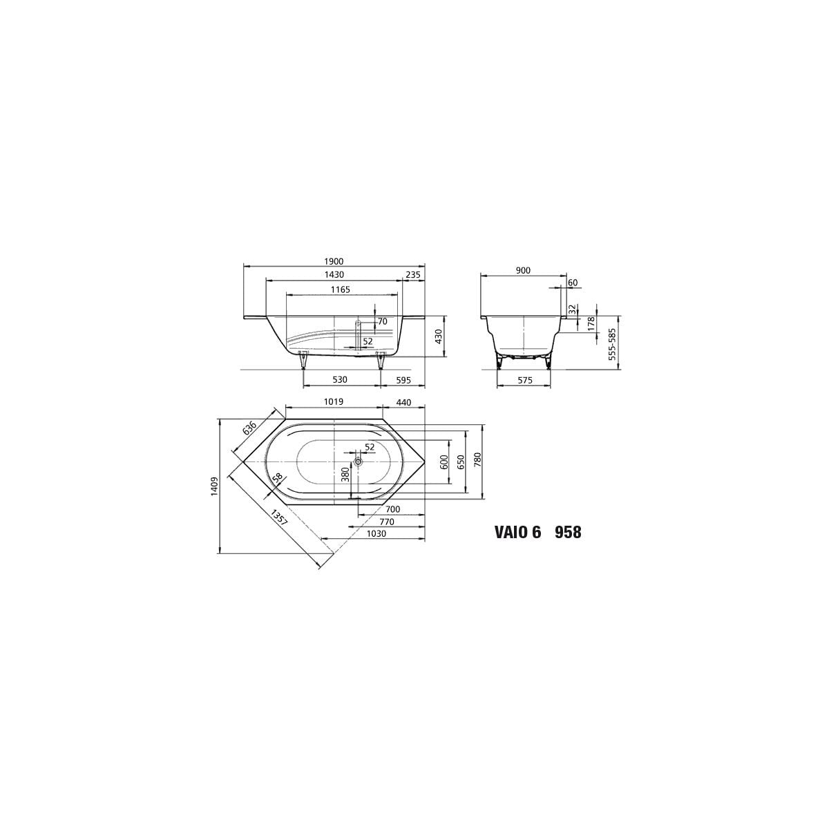 - široká vana pro jednu osobu s bočním přepadem a integrovanými područkami