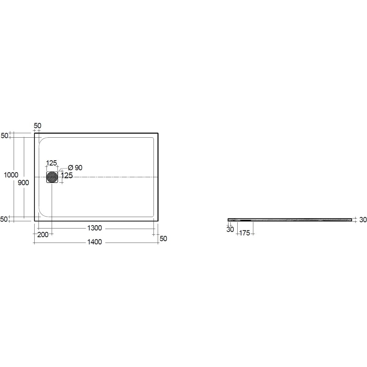 - odtok umístěný uprostřed podél kratší strany Ø 9 cm