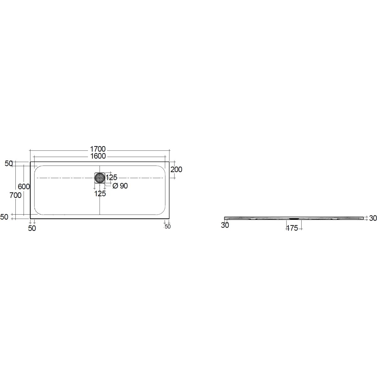 - odtok umístěný uprostřed podél delší strany Ø 9 cm