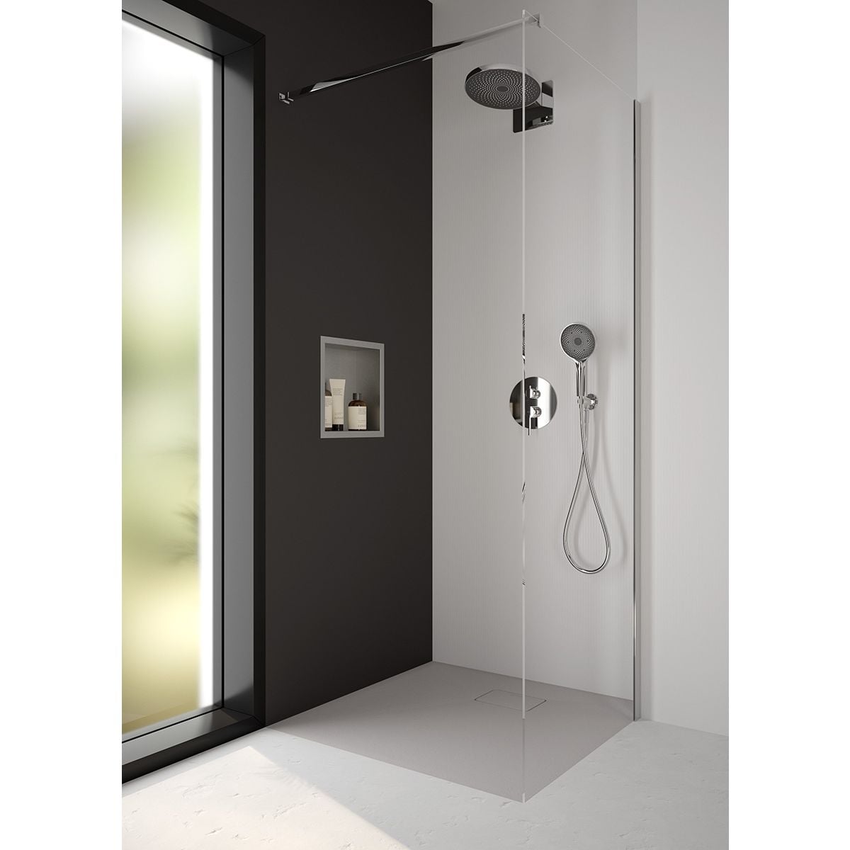 Montáž — pravá nebo levá (univerzální). Stěnová konzola s délkou 1200 mm, možnost zkrácení. Díky tomuto řešení upravíte sprchový kout podle vlastních potřeb a výšky koupelny. Sprchový kout typu walk‑in zdůrazní moderní charakter každé koupelny, bez ohledu na její styl.