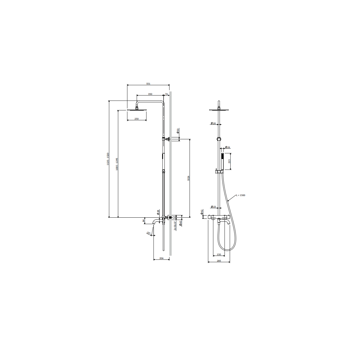 - mosazná dešťová sprcha, velikost: ø25 cm, dosah od stěny: délka: 42 cm