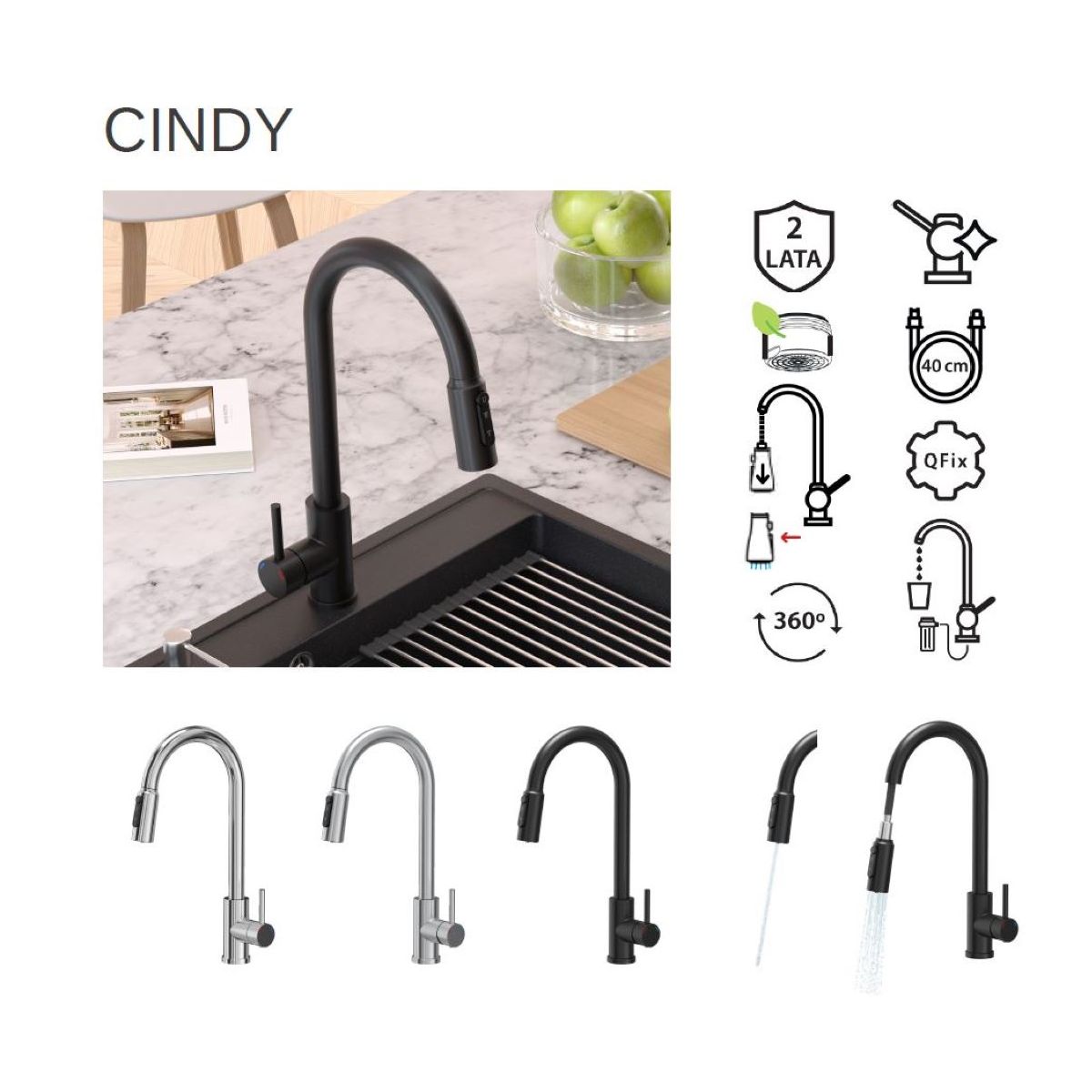 Baterie CINDY je ocelová kuchyňská baterie, která kombinuje moderní design s pokročilými funkcemi a dokonale odpovídá potřebám moderních kuchyní. Možnost připojení k vodnímu filtru a přídavné tlačítko pro filtrovanou vodu zajišťuje přístup ke křišťálově čisté vodě a pečuje o zdraví celé rodiny. Jedná se nejen o komfortní, ale i praktické řešení pro každý den.
