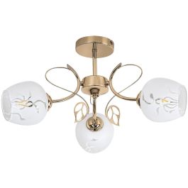 Klasická trojitá stropní lampa Fauna bude elegantním doplňkem tradičního vybavení obývacího pokoje nebo ložnice. Stínidla z bílého vzorovaného skla jsou připevněna ke zlatému kovovému rámu. Lampu lze připevnit ke stropu pomocí kulatého ozdobného podstavce. Kulatá stínidla s otevřeným dnem jsou připevněna ke zkrouceným ramenům lampy a jsou zdobena zlatými listy.