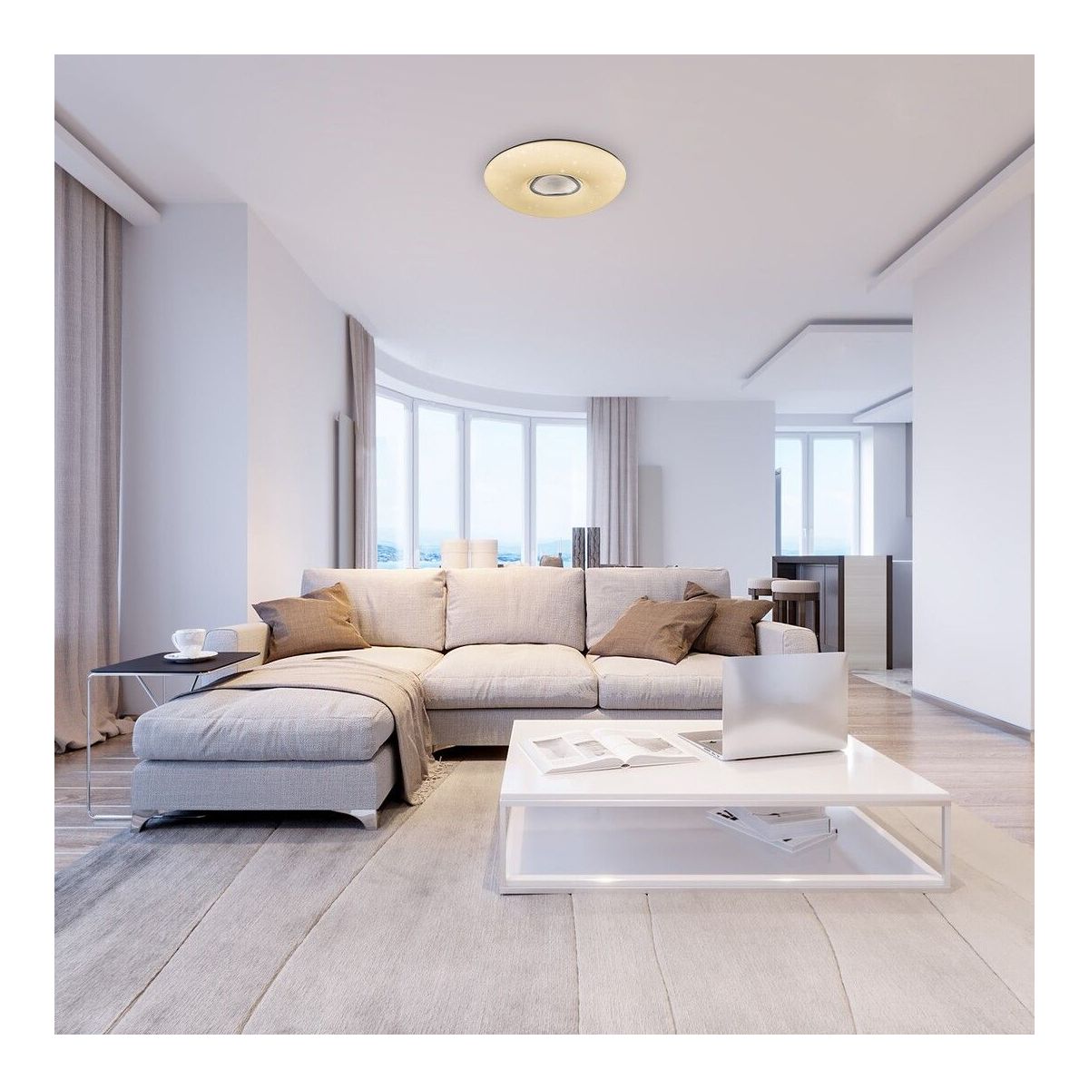Stropní svítidlo Tayla je vyrobeno z kovu a plastu a nabízí mnohem víc než standardní osvětlení. Tento velký kulatý model s lesklým efektem doporučujeme zejména do obývacího pokoje nebo ložnice. Spotřeba energie jeho zabudovaného světelného zdroje LED o je 60 W, jeho svítivost je 4 200 lumenů a životnost 25 000 hodin. Díky vysoké intenzitě můžete s touto chytrou lampou efektivně osvětlit i prostornou místnost. Barevnou teplotu modelu Tayla lze nastavit v rozmezí 3 000 až 6 500 K, což znamená, že může osvětlit místnost teplým, přirozeným nebo studeným bílým světlem. Toto bílé stropní svítidlo má také nastavitelnou úroveň jasu. Můžete jej ovládat pomocí dálkového ovladače. Vzdálenost tohoto svítidla o průměru 500 mm od stropu je 92 mm. Na tento chytrý model se vztahuje pětiletá záruka.