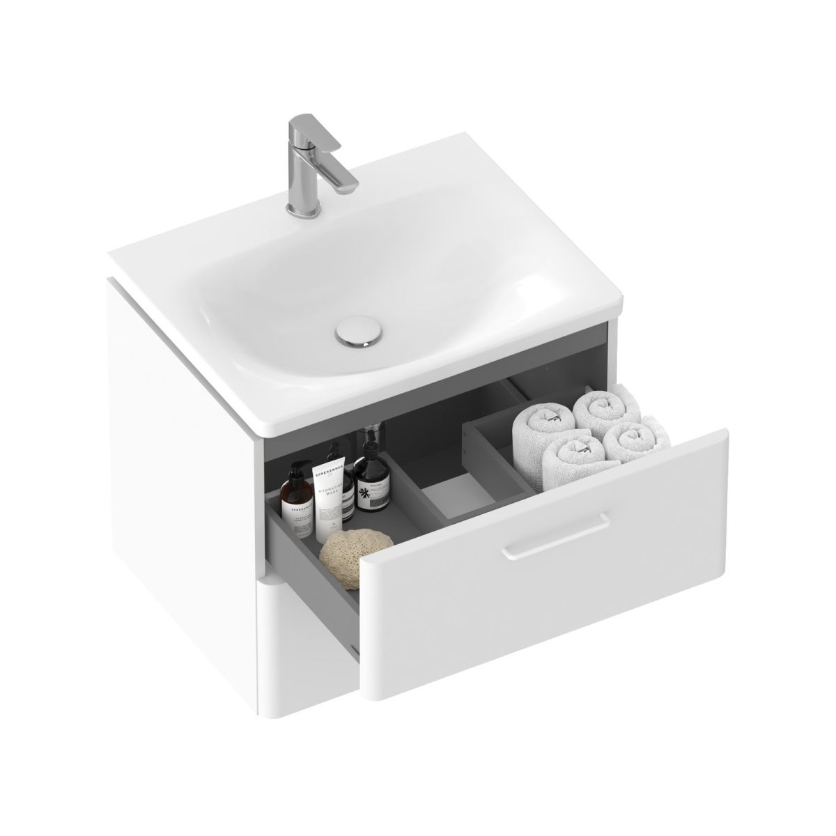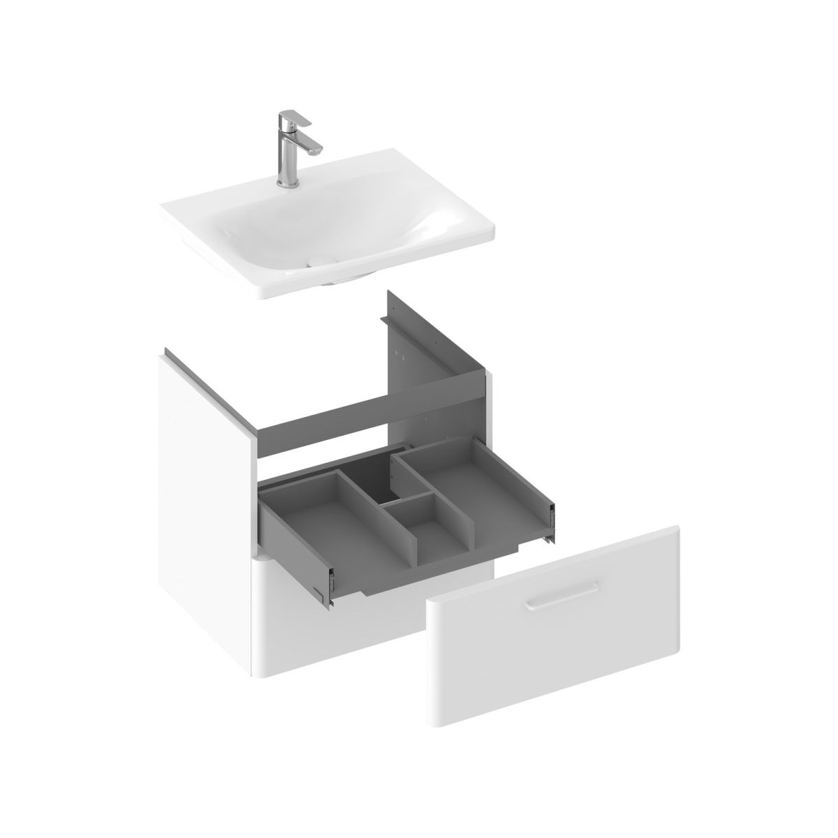 Interiér skříňky je v grafitové barvě. Dvě zásuvky se systémem tichého dovírání poskytnou dostatek úložného prostoru. Skříňka má předvrtané otvory pro úchytky, které nejsou součástí skříňky a je nutné je dokoupit zvlášť (2 ks). Na výběr jsou tři barvy: lesklý chrom, černá nebo bílá. Skříňka je určena pro umyvadlo Balance 60 bez přepadu. Skříňku lze také kombinovat s deskou Balance 60/120 v bílé barvě, konzolami na desku Balance/Comfort 120, bílým držákem ručníků Balance II a umyvadlem na desku (např. série Uni / Uni Slim). Skříňka se dodává již smontovaná s montážní sadou (šrouby, závěsy, hmoždinky). Určeno k montáži na stěnu.