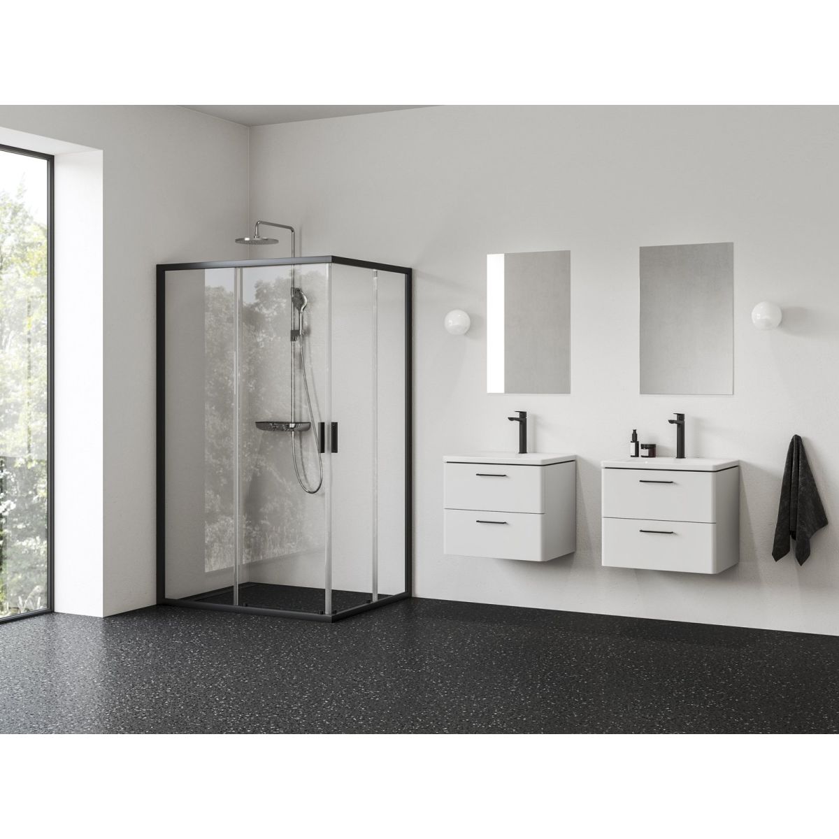 1/2 rohový sprchový kout Blix II v černém provedení s výplní z čirého skla s ochrannou vrstvou Ravak AntiCalc®. Posuvný systém otevírání. Kompletní výrobek se skládá ze dvou sprchových dveří.