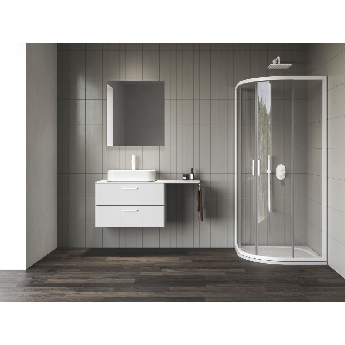 Čtyřdílný půlkruhový sprchový kout Blix II v bílém matném provedení s výplní z čirého skla s ochranou Ravak AntiCalc®. Posuvný systém otevírání.