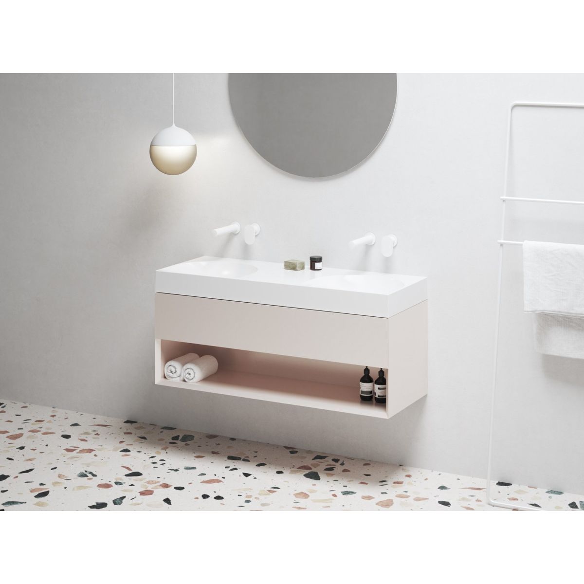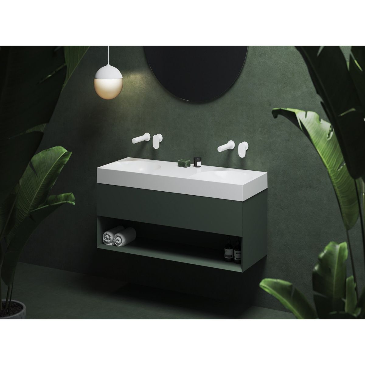 Dvojité umyvadlo Lite 120 s úložným prostorem. Umyvadlo není vybaveno přepadem, proto je k zabránění přetečení nutné použít pevný stojan na umyvadlo. Umyvadlo je určeno ke kombinaci se skrytou umyvadlovou baterií. Součástí dodávky je montážní sada (spojovací kolíky, šrouby atd.). Lze jej namontovat na stěnu nebo doplnit umyvadlovou skříňkou SD Lite 120.