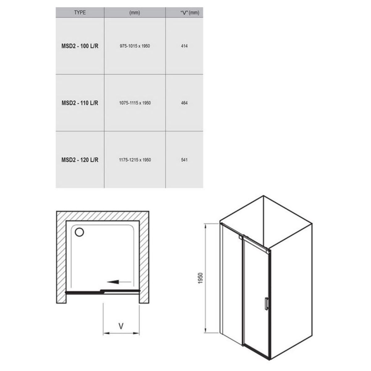 Produkt se skládá ze dvou částí, z nichž jedna je posuvná dvířka. Montáž do výklenku přímo na podlahu s vestavěným lineárním odtokem nebo odtokovou mřížkou.