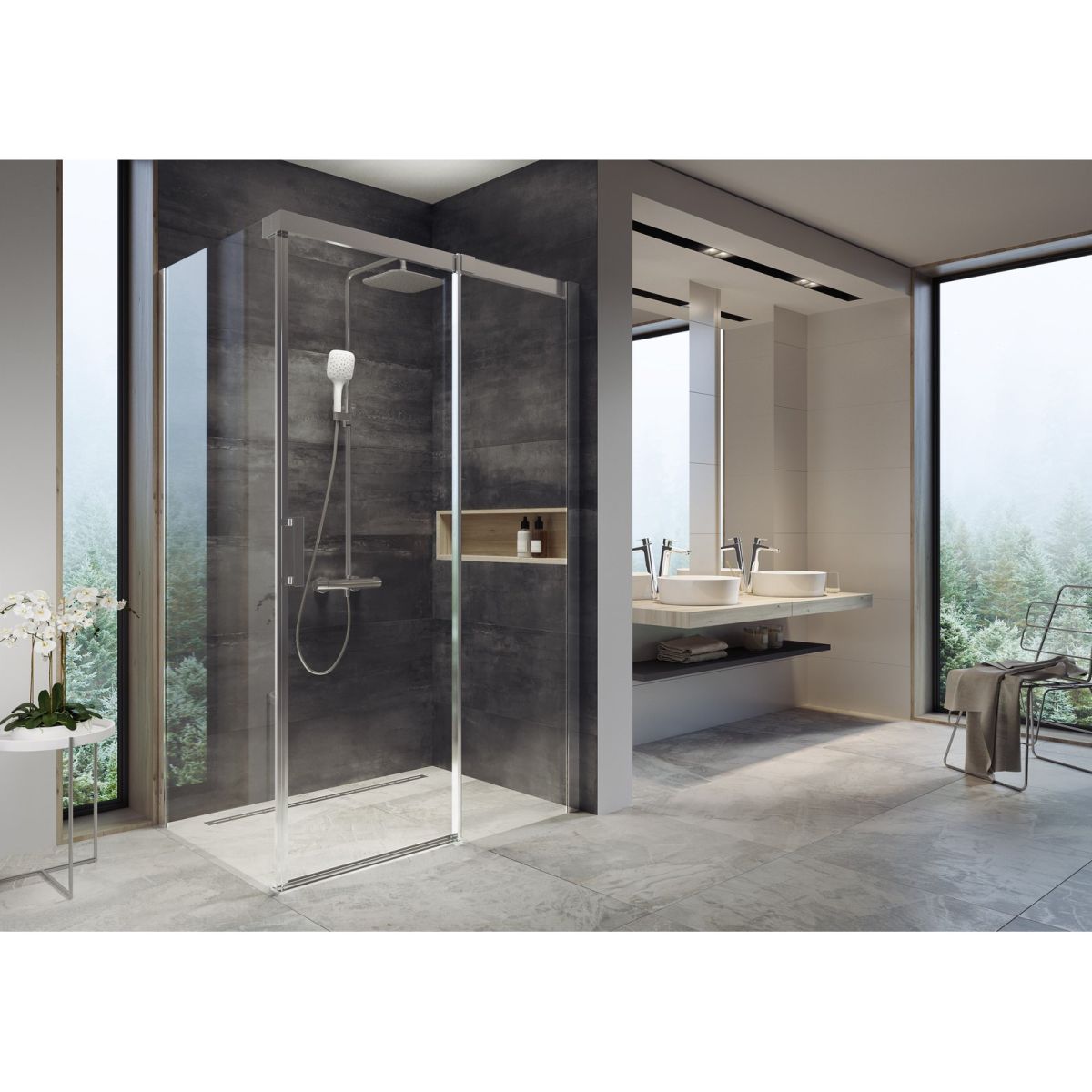 Rohová sprchová kabina Matrix v provedení lesklý chrom s výplní z čirého skla s ochrannou vrstvou Ravak AntiCalc®. Posuvný systém otevírání. Varianta pravá.