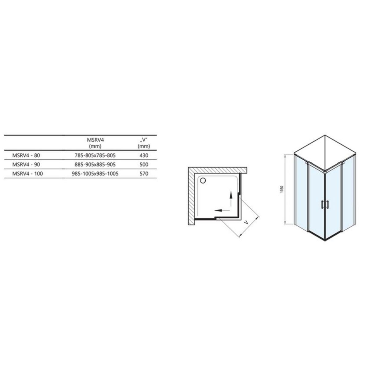 Kabinová sprcha se skládá ze dvou pevných a dvou pohyblivých částí, které tvoří posuvné dveře. Montáž v obloženém rohu koupelny přímo na podlahu s vestavěným lineárním odtokem nebo odtokovou mřížkou.