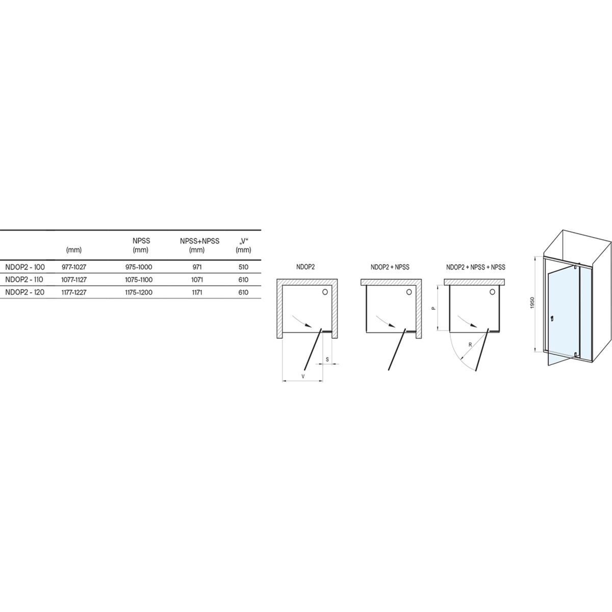 Produkt se skládá z jednoho jednoduchého pevného a jednoho otočného prvku, které tvoří dveře. Otočením produktu o 180° získáte levou nebo pravou verzi otevírání dveří. Montáž do výklenku nebo obloženého rohu koupelny v kombinaci s pevnou stěnou NPSS na vaničce Ravak nebo přímo na podlahu s vestavěným lineárním odtokem nebo odtokovou mřížkou.