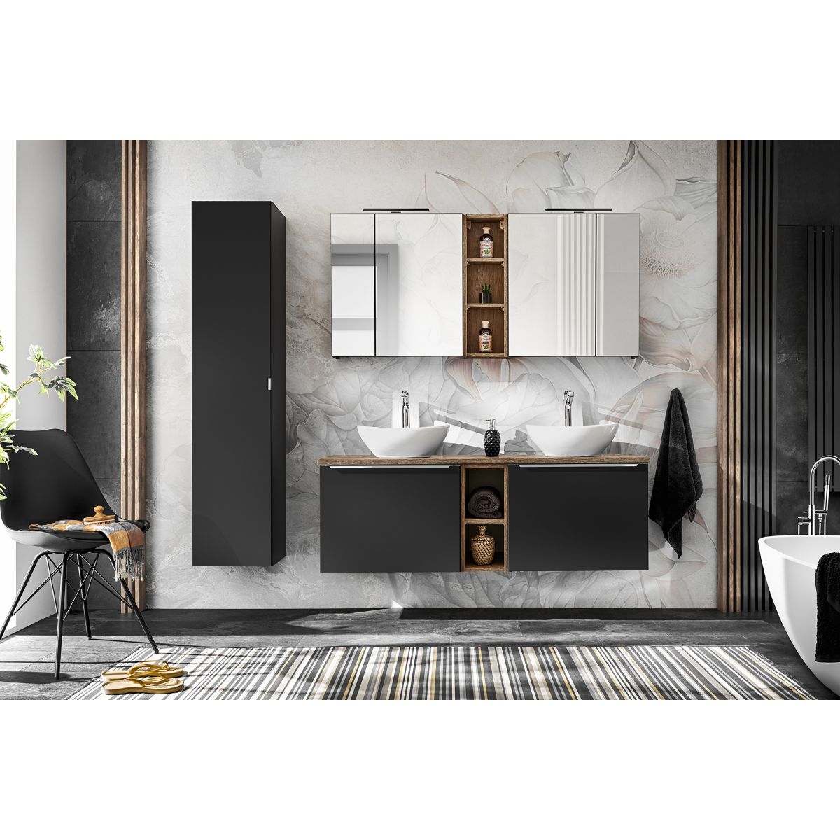 Santa Fe Black jsou masivy navržené v moderním stylu, díky kterému snadno zapadnou do téměř jakéhokoli uspořádání. Čela a korpus v barvě černé orchideje v kombinaci s chromovými úchyty působí celek lehce a elegantně. Zrcadlové skříňky, které jsou součástí kolekce, opticky zvětšují koupelnu a poskytují další úložný prostor. Koupelnový nábytek z kolekce Santa Fe Black je pohodlný na používání a funkční. Kolekce zahrnuje skříňky pod umyvadlo, vysoký bar, zrcadlové skříňky, spodní a horní polici. Široká škála skříněk činí z této kolekce jednu z nejmodulárnějších v naší nabídce, díky čemuž se hodí do koupelen téměř všech rozměrů. Abychom vyšli vstříc našim zákazníkům, doplňujeme tuto kolekci o organizér zásuvek. Je funkční nejen díky dokonalému zakrytí výřezu sifonu, ale také proto, že poskytuje další úložný prostor v zásuvce.
