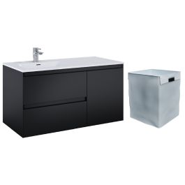 Skříňka pod umyvadlo Split 100, skládá se ze skříňky pod umyvadlo 60 a komody 40 s nákladovým košem, umístěné na pravé straně. Podumyvadlová skříňka se 2 zásuvkami s kovovými boky, s plným výsuvem a systémem Soft-Close. Nákladní koš v komodě má robustní výsuvy s nosností až 20 kg, s plným výsuvem a systémem soft-close. Skříňka je vyrobena z vysoce kvalitních materiálů, čelo a korpus z laminované desky, lakované v černém matu. Tvarované úchytky profilované pod úhlem 45°. Skříňku lze kombinovat s pracovními deskami ElitStone.