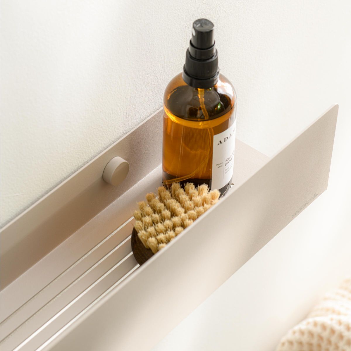Stylová nástěnná police o délce 35 cm je ideální volbou pro ty, kteří ocení moderní design a praktická řešení. Skvěle se hodí do koupelny jako místo pro láhve se šamponem, dávkovač mýdla nebo difuzér vůně. Díky vysoké přední části zůstanou všechny předměty na svém místě a chytré odtokové otvory zabraňují hromadění vody, což usnadňuje udržování čistoty.