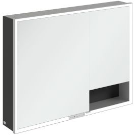 LED páska kolem zrcadla zajišťuje rovnoměrné osvětlení a integrované osvětlení umyvadla a podsvícené otevřené přihrádky vytvářejí příjemnou atmosféru. Jas a barevnou teplotu lze pohodlně regulovat pomocí senzoru nebo ovladače Smart Home. Jemné úchytky umožňují pohodlné otevírání dvířek bez zanechání otisků prstů a dvojitá zásuvka uprostřed poskytuje další funkčnost.