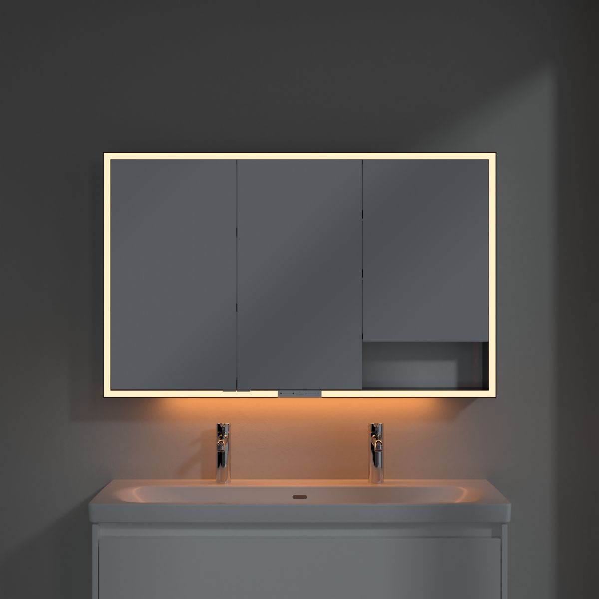 LED páska kolem zrcadla zajišťuje rovnoměrné osvětlení a integrované osvětlení umyvadla a podsvícené otevřené přihrádky vytvářejí příjemnou atmosféru. Jas a barevnou teplotu lze pohodlně regulovat pomocí senzoru nebo ovladače Smart Home. Jemné úchytky umožňují pohodlné otevírání dvířek bez zanechání otisků prstů a dvojitá zásuvka uprostřed poskytuje další funkčnost.