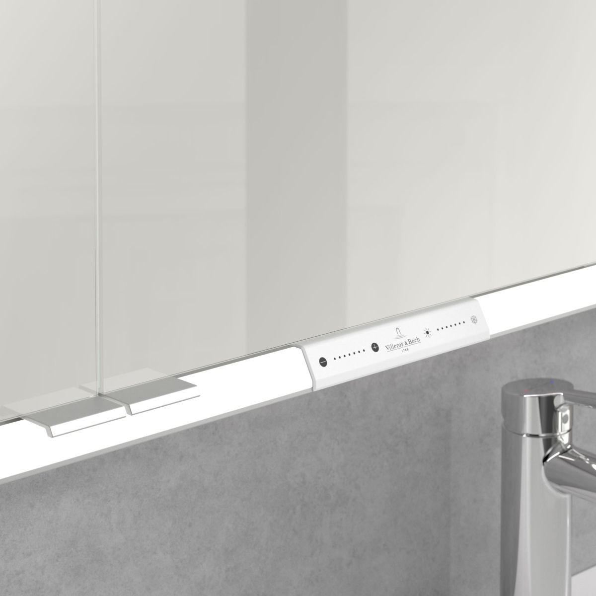 LED páska obklopující zrcadlo zajišťuje rovnoměrné osvětlení a integrované osvětlení umyvadla a podsvícené otevřené přihrádky vytvářejí příjemnou atmosféru. Jas a barevnou teplotu lze pohodlně regulovat pomocí senzoru nebo ovladače Smart Home. Jemné úchytky umožňují pohodlné otevírání dvířek bez zanechání otisků prstů a dvojitá zásuvka uprostřed poskytuje další funkčnost.