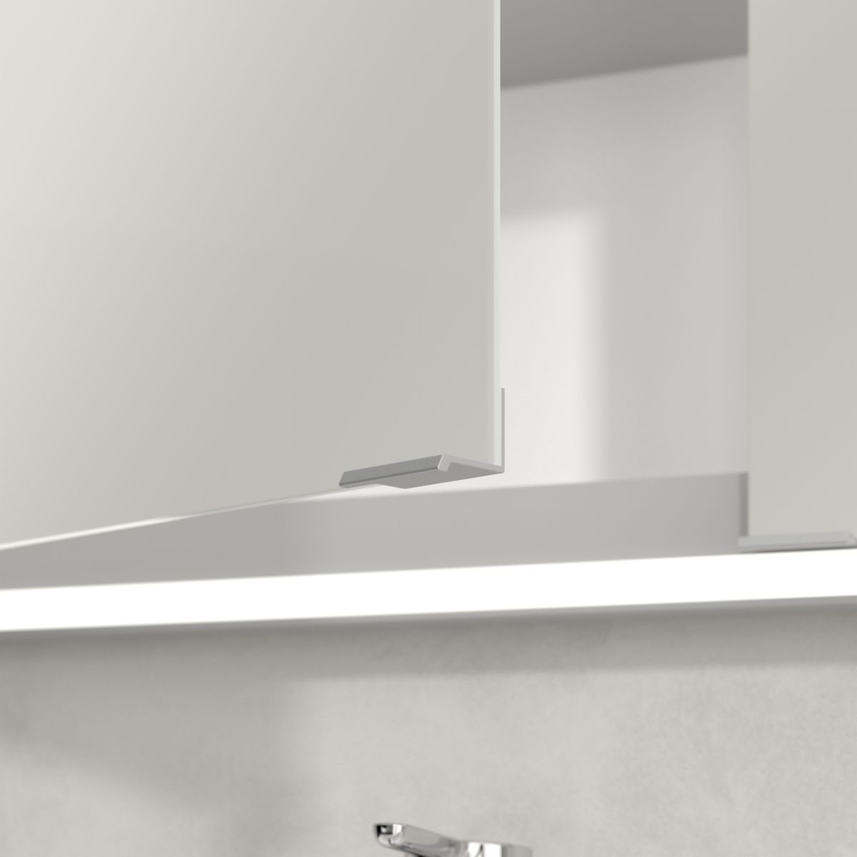 LED páska kolem zrcadla zajišťuje rovnoměrné osvětlení a integrované osvětlení umyvadla a podsvícené otevřené komory vytvářejí příjemnou atmosféru. Jas a barevnou teplotu lze pohodlně regulovat pomocí senzoru nebo ovladače Smart Home. Jemné úchytky umožňují pohodlné otevírání dvířek bez zanechání otisků prstů a dvojitá zásuvka uprostřed poskytuje další funkčnost.