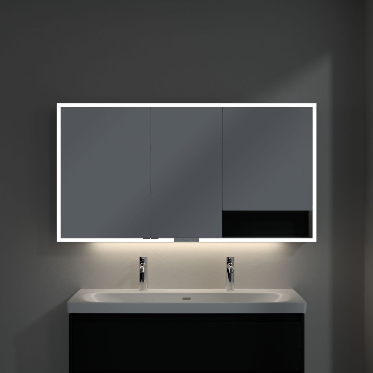 LED páska kolem zrcadla zajišťuje rovnoměrné osvětlení a integrované osvětlení umyvadla a podsvícené otevřené přihrádky vytvářejí příjemnou atmosféru. Jas a barevnou teplotu lze pohodlně regulovat pomocí senzoru nebo ovladače Smart Home. Jemné úchytky umožňují pohodlné otevírání dvířek bez zanechání otisků prstů a dvojitá zásuvka uprostřed poskytuje další funkčnost.
