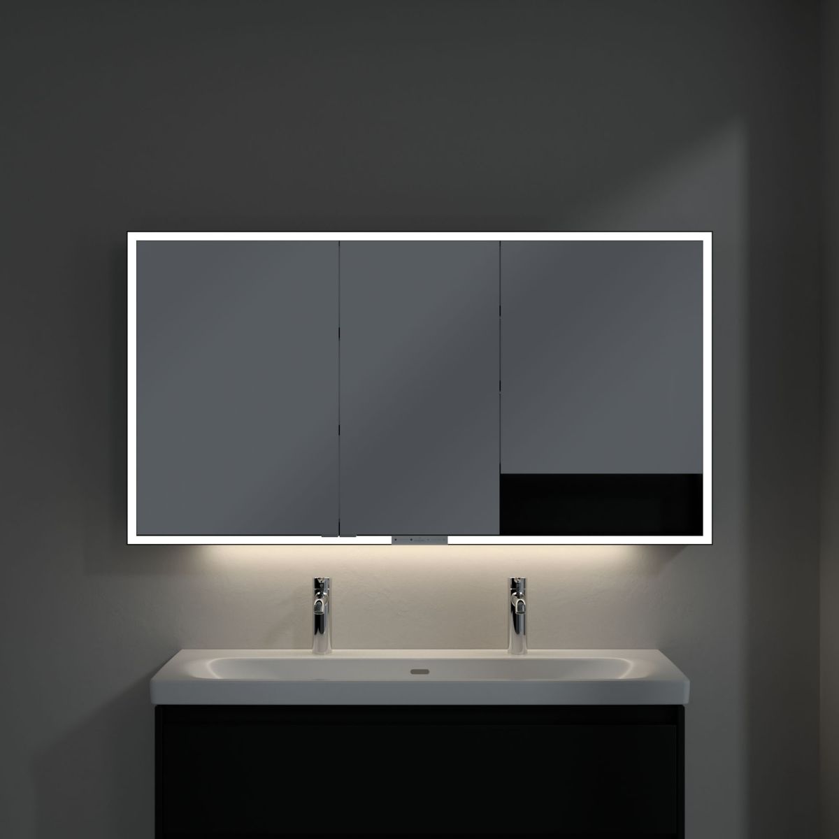 LED páska kolem zrcadla zajišťuje rovnoměrné osvětlení a integrované osvětlení umyvadla a podsvícené otevřené přihrádky vytvářejí příjemnou atmosféru. Jas a barevnou teplotu lze pohodlně regulovat pomocí senzoru nebo ovladače Smart Home. Jemné úchytky umožňují pohodlné otevírání dvířek bez zanechání otisků prstů a dvojitá zásuvka uprostřed poskytuje další funkčnost.