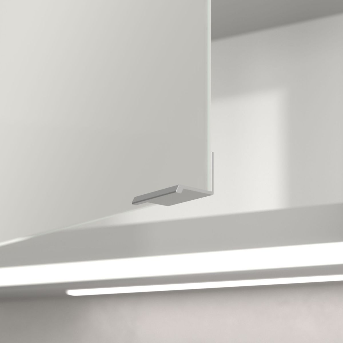 LED páska kolem zrcadla zajišťuje rovnoměrné osvětlení a integrované osvětlení umyvadla a podsvícené otevřené přihrádky vytvářejí příjemnou atmosféru. Jas a barevnou teplotu lze pohodlně regulovat pomocí senzoru nebo ovladače Smart Home. Jemné úchytky umožňují pohodlné otevírání dvířek bez zanechání otisků prstů a dvojitá zásuvka uprostřed poskytuje další funkčnost.