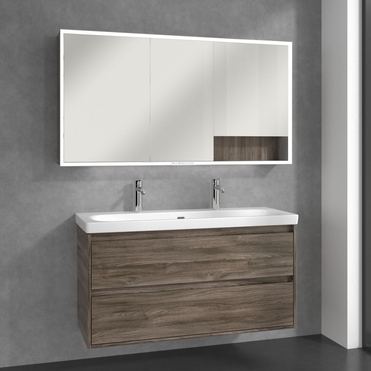 LED páska kolem zrcadla zajišťuje rovnoměrné osvětlení a integrované osvětlení umyvadla a podsvícené otevřené přihrádky vytvářejí příjemnou atmosféru. Jas a barevnou teplotu lze pohodlně regulovat pomocí senzoru nebo ovladače Smart Home. Jemné úchytky umožňují pohodlné otevírání dvířek bez zanechání otisků prstů a dvojitá zásuvka uprostřed poskytuje další funkčnost.