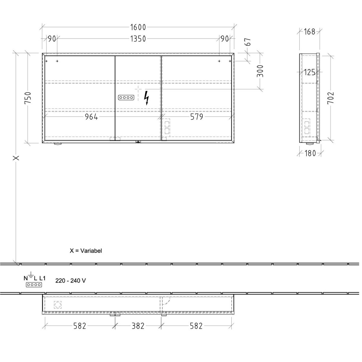 - vybavení: 3 x dvířka, 1 x senzorový spínač na vnější straně, 2 x zásuvka uvnitř, 4 x hliníkové police, 1 x otevřený úložný prostor vpravo dole, 1 x nádoba, 1 x zvětšovací zrcátko, 1 x magnetická lišta- materiál korpusu: hliník