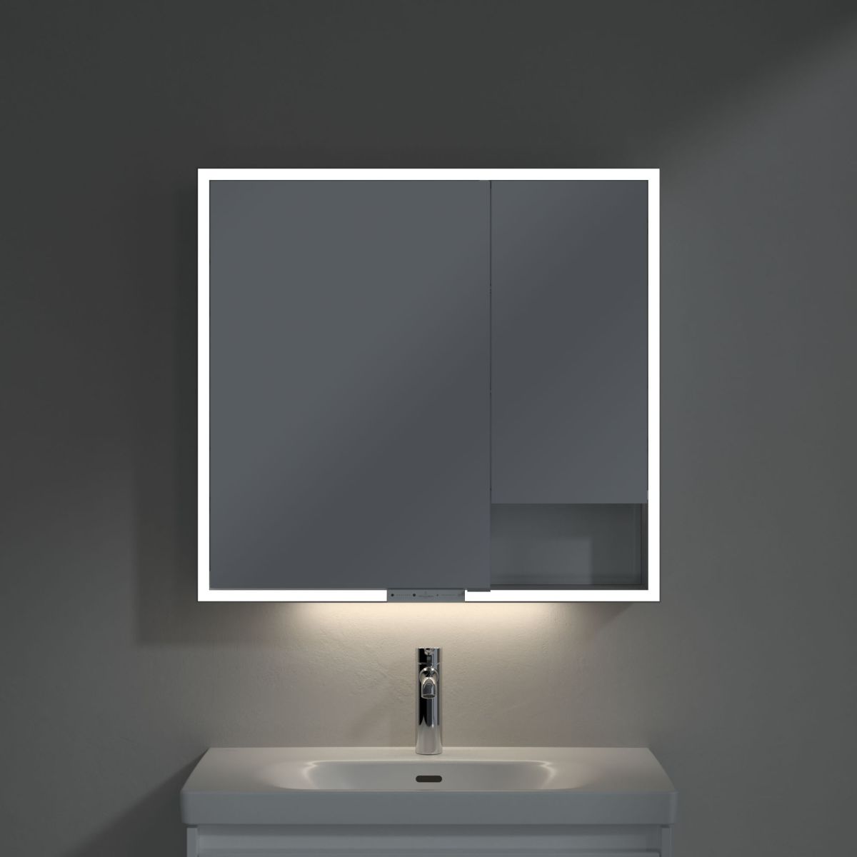LED páska kolem zrcadla zajišťuje rovnoměrné osvětlení a integrované osvětlení umyvadla a podsvícené otevřené přihrádky vytvářejí příjemnou atmosféru. Jas a barevnou teplotu lze pohodlně regulovat pomocí senzoru nebo ovladače Smart Home. Jemné úchytky umožňují pohodlné otevírání dveří bez zanechání otisků prstů a dvojitá zásuvka uprostřed poskytuje další funkčnost.