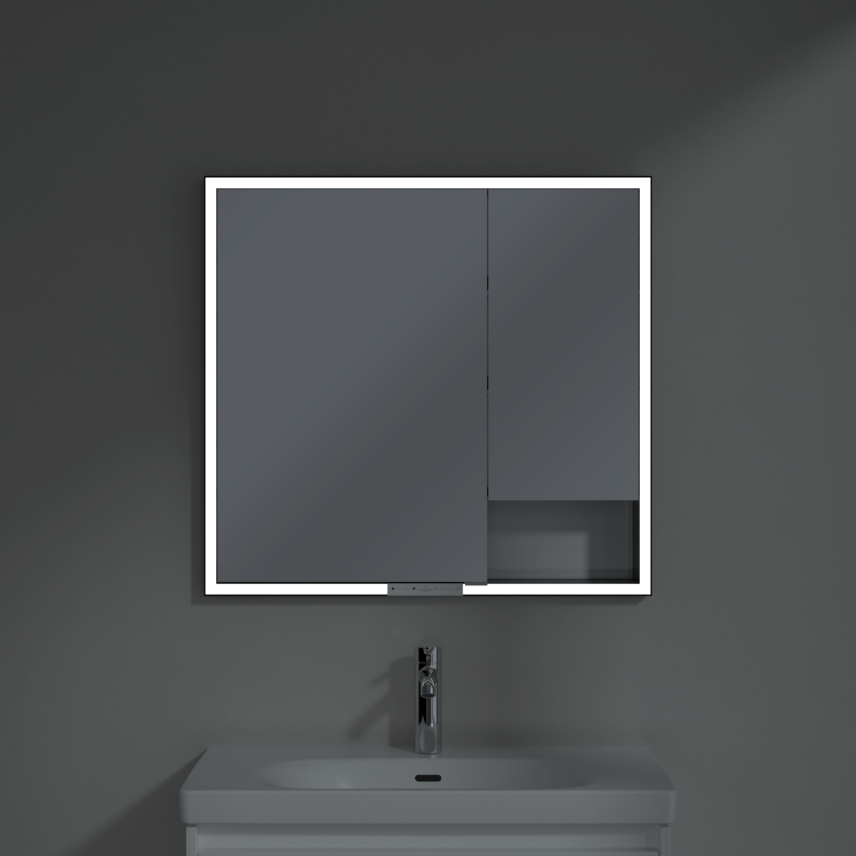 LED páska kolem zrcadla zajišťuje rovnoměrné osvětlení a integrované osvětlení umyvadla a podsvícené otevřené komory vytvářejí příjemnou atmosféru. Jas a barevnou teplotu lze pohodlně regulovat pomocí senzoru nebo ovladače Smart Home. Jemné úchytky umožňují pohodlné otevírání dvířek bez zanechání otisků prstů a dvojitá zásuvka uprostřed poskytuje další funkčnost.
