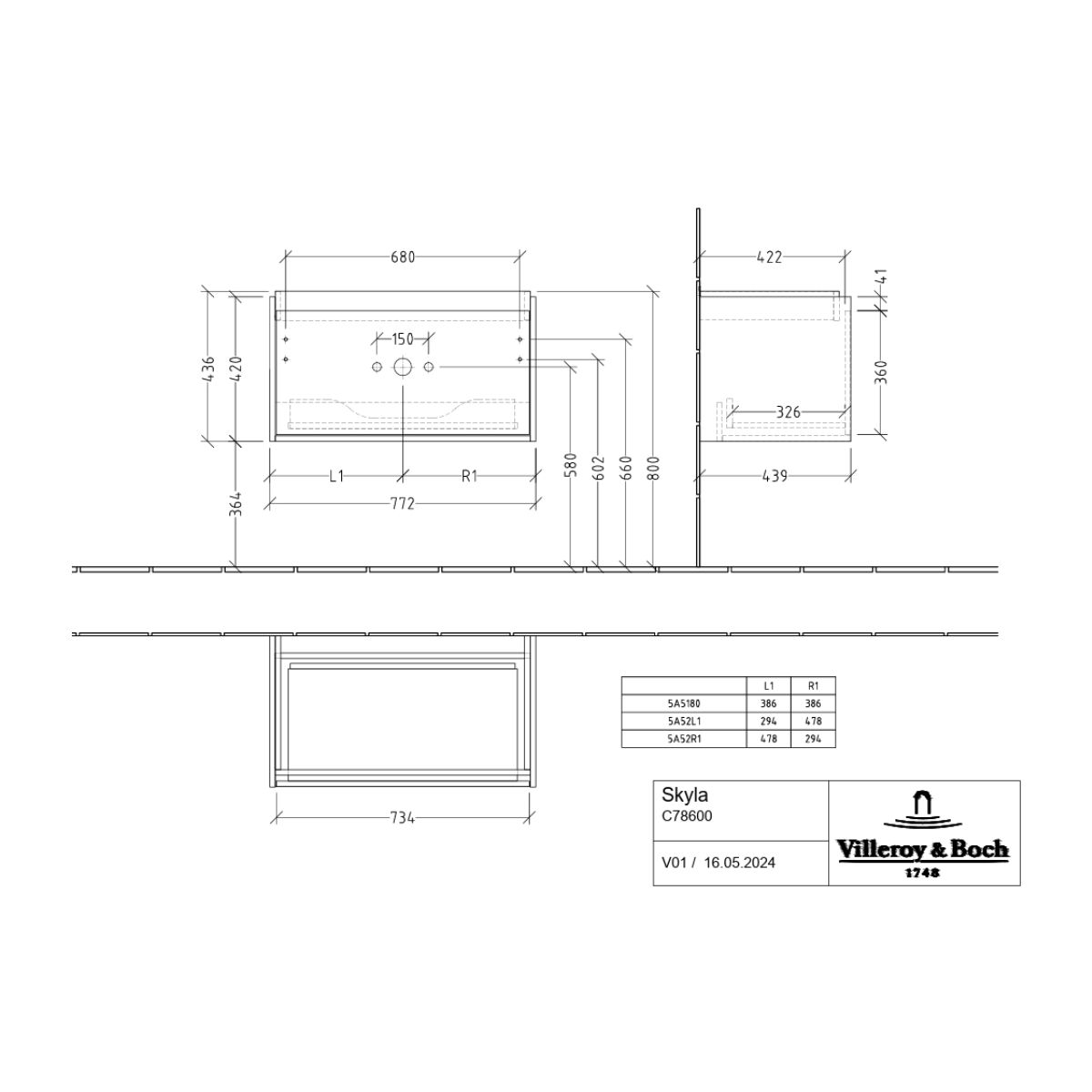 Villeroy & Boch Skyla skříňka 77.2x43.9x43.6 cm pod umyvadlo závěsná dub C78600RK