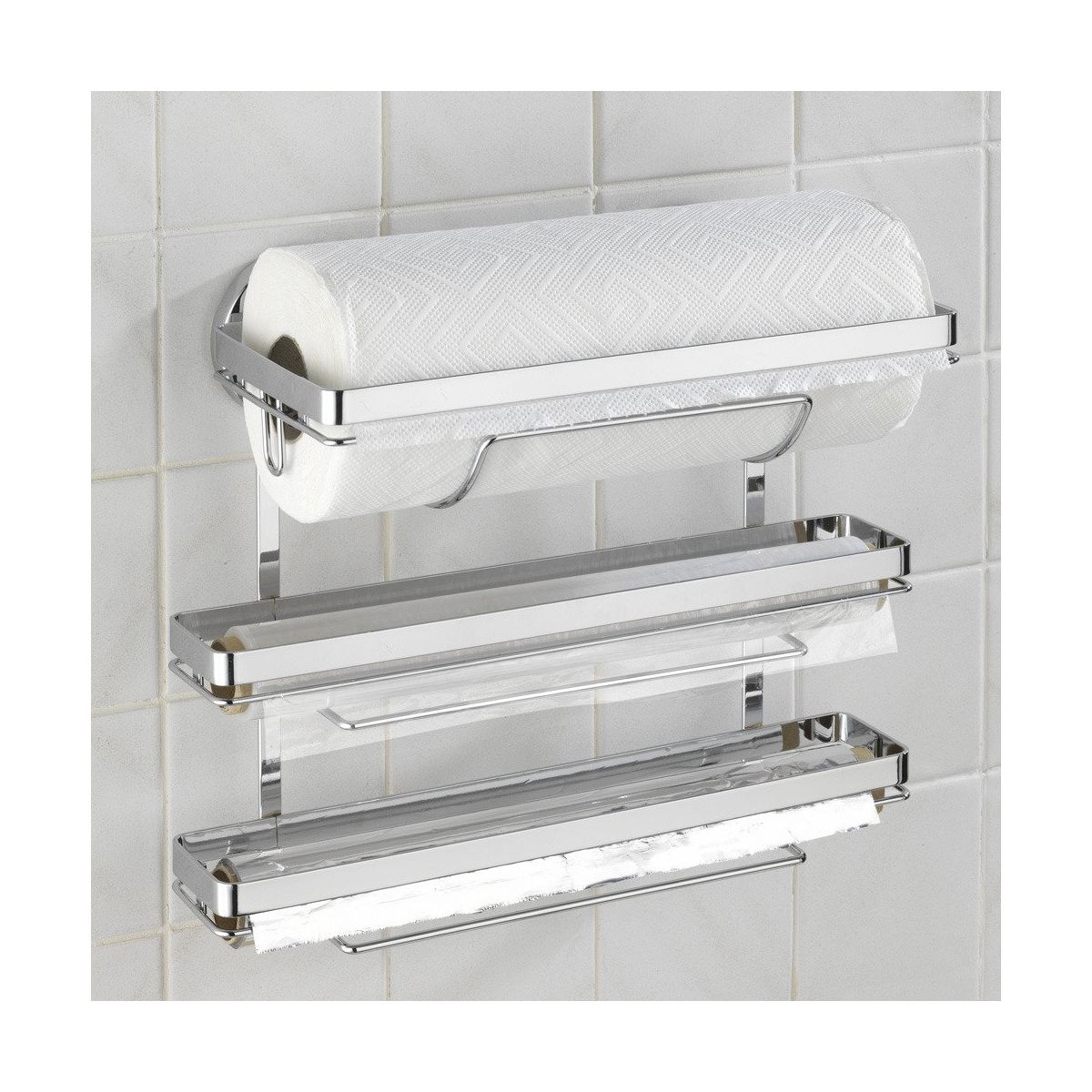 Pohodlný držák papírových utěrek se dvěma přídavnými zásobníky např. na hliníkovou fólii nebo pečicí papír. Výrobek vám umožní uložit několik předmětů na jednom místě a udržet tak v kuchyni pořádek.